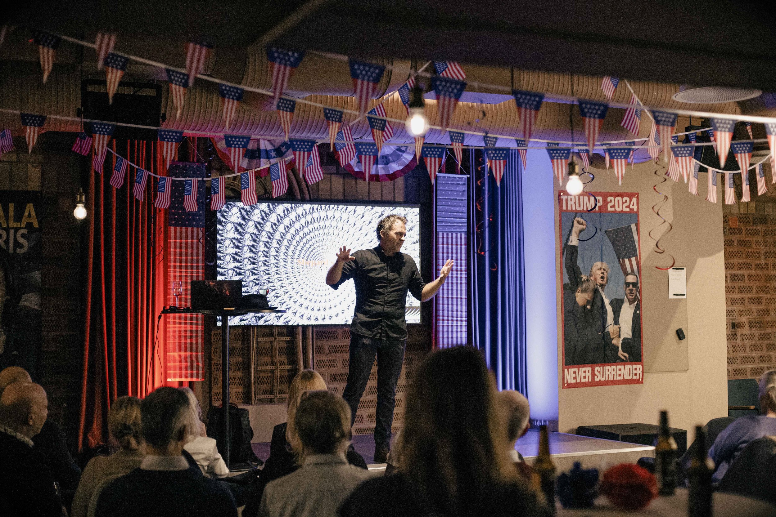 En mann står på en scene og holder en tale eller presentasjon foran et publikum, med Donald Trump 2024-plakat og amerikanske flaggdekorasjoner i bakgrunnen.